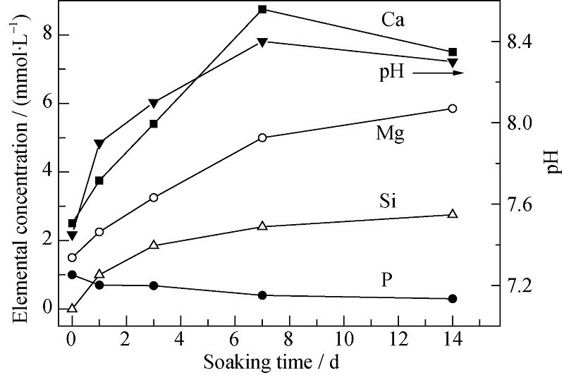 VALLET-REGI V, SALINAS A J, ROMAN J, et al.Effect of magnesium content on the in vitro bioactivity of CaO-MgO-SiO2-P2O5 Sol-Gel glasses.J. Mater. Chem., 1999, 9: 515-518.