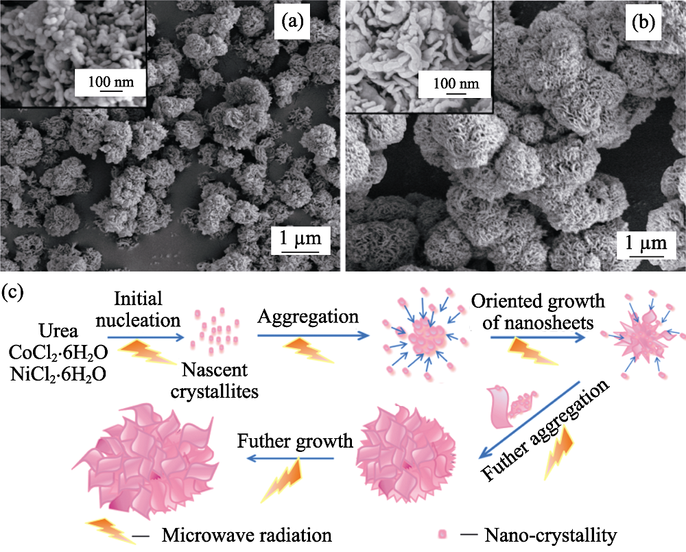 图3 (a)~(b) 微波辅助法获得的花状NiCo2O4的SEM照片, (c) 花状形貌形成过程示意图[46]