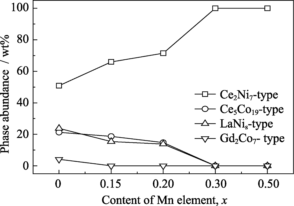采用真空电弧熔炼和均匀化退火制备La0.3Y0.7Ni3.4-xMnxAl0.1(x=0~0.5)储氢合金, 采用不同方法系统研究了Mn元素对合金微观结构、储氢和电化学性能的影响规律和作用。结果表明, 退火合金微观组织与Mn含量关系密切, 提高Mn含量有利于合金组织形成Ce2Ni7型相, 当x≥0.3时, 合金形成Ce2Ni7型结构单相组织。随Mn含量增加, Ce2Ni7型主相晶胞参数a、c及晶胞体积V均依次增大, 导致合金吸氢平台压从0.079 MPa降至0.017 MPa, 储氢量达到1.268wt%~1.367wt%。添加Mn元素能显著改善合金的电化学性能, x=0.1的合金电极的放电容量最高(390.4 mAh·g -1); x=0.15和0.5的合金电极的容量保持率S100分别为86.1%和88.5%, 具有较好的循环稳定性。上述合金电极的高倍率放电性能HRD900为71.53%~87.73%。分析结果表明, 合金电极反应动力学过程由电极/溶液界面的电子转移与体相中的氢原子扩散共同控制。