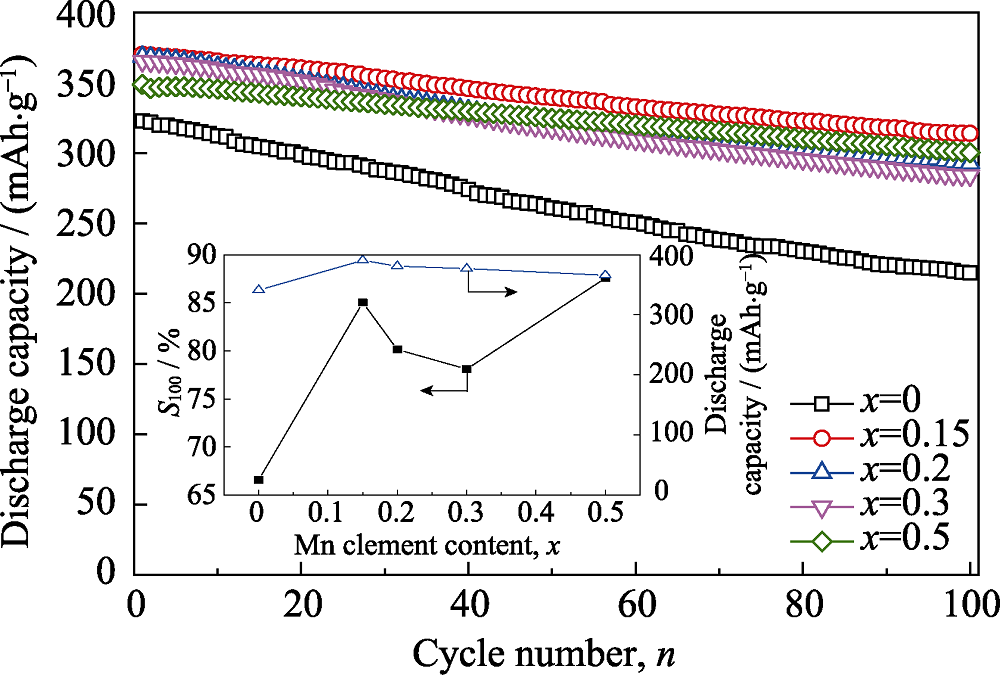 图8 合金电极的充放电循环曲线及(插图)S100、放电容量与Mn含量的关系曲线