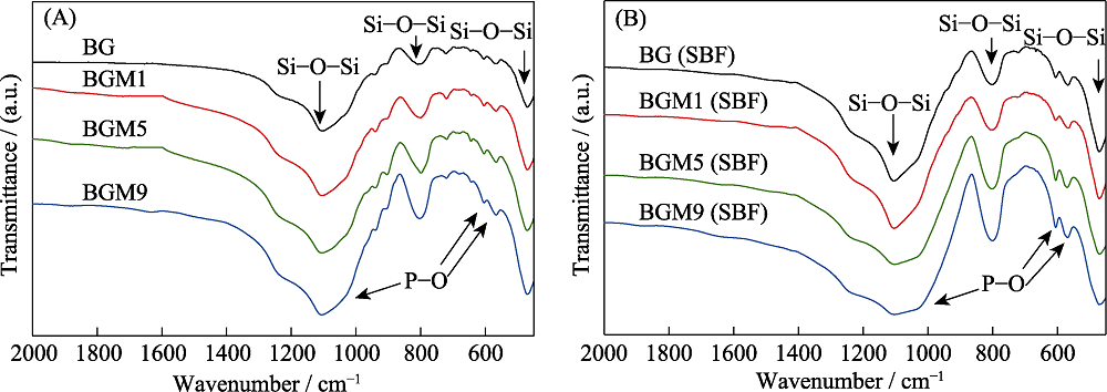 图5 (A)BG和BGM支架在Tris-HCl中浸泡28 d的降解曲线及(B)BG和BGM支架在SBF中浸泡14 d的pH变化曲线