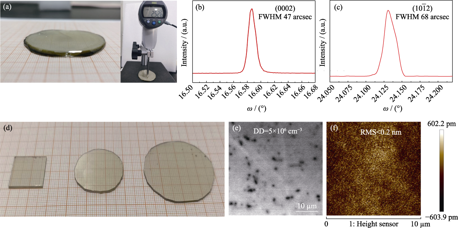 Fig. 3 Photos and characterization of GaN crystals grown by HVPE (a) 2-inch 2.5 mm thick GaN crystal; (b) (0002) surface high-resolution XRD pattern; (c) (10¯12) high-resolution XRD pattern; (d) Image of GaN wafers; (e) CL image (dislocation density ~5×106 cm-2); (f) AFM image (RMS<0.2 nm in the range of 10 μm×10 μm)
