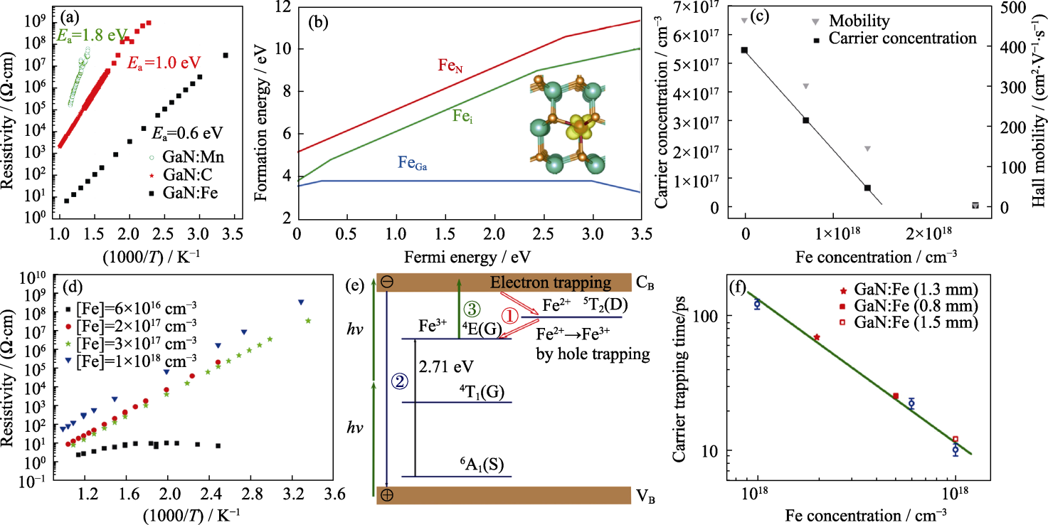 Fig. 8 Fe-doped GaN (a) Resistivity as a function of reciprocal temperature for samples doped with Mn, C, and Fe[8]; (b) Formation energy versus Fermi level for FeGa, FeN and Fei in GaN in different charge states, under Ga-rich conditions[68]; (c) Carrier concentration and Hall mobility versus Fe concentration in GaN films co-doped with Si and Fe[70]; (d) Resistivity versus inverse temperature for samples doped with Fe at various Fe concentrations[63]; (e) Schematic diagram of the energy levels and carrier decay processes of Fe-doped GaN[71]; (f) Carrier trapping time for Fe-doped GaN bulk crystals[72]