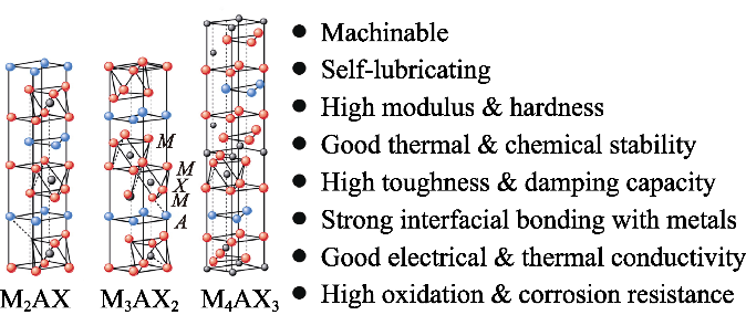 Fig. 1 Atomic structures and advantageous properties of MAX phase ceramics[6] With permission from Ref. [6] Copyright 2011, Annual Reviews