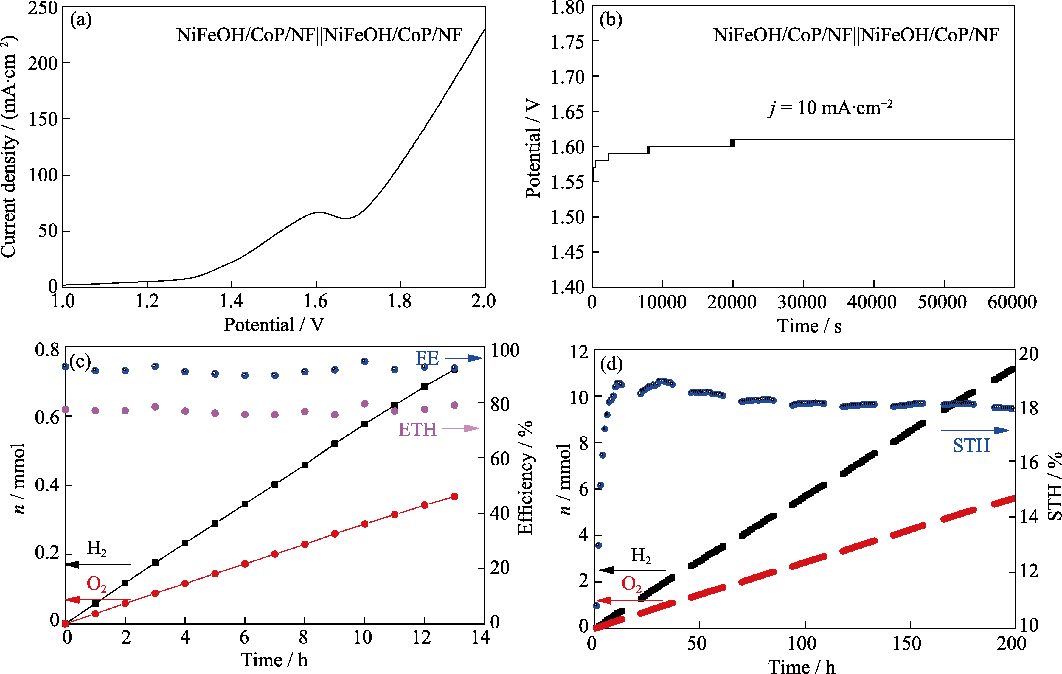 Fig. 5 Electrocatalytic overall water splitting properties of NiFeOH/CoP/NF-200s||NiFeOH/CoP/NF-200s two electrode system and hydrogen production efficiency of the photovoltaic-electrocatalytic system consisting of two electrode cell and GaAs solar cell (a) LSV curve; (b) Long term chronopotentiometry plot at current density of 10 mA/cm2; (c) Galvanostatic electrocatalytic hydrogen and oxygen evolution curves, Faradic efficiency (FE), and electricity to hydrogen efficiency curves (ETH); (d) Hydrogen, oxygen evolution and corresponding solar to hydrogen efficiency curves of a photovoltaic-electrocatalytic system consisting of NiFeOH/CoP/NF-200s||NiFeOH/CoP/NF-200s electrocatalytic cell and GaAs solar cell