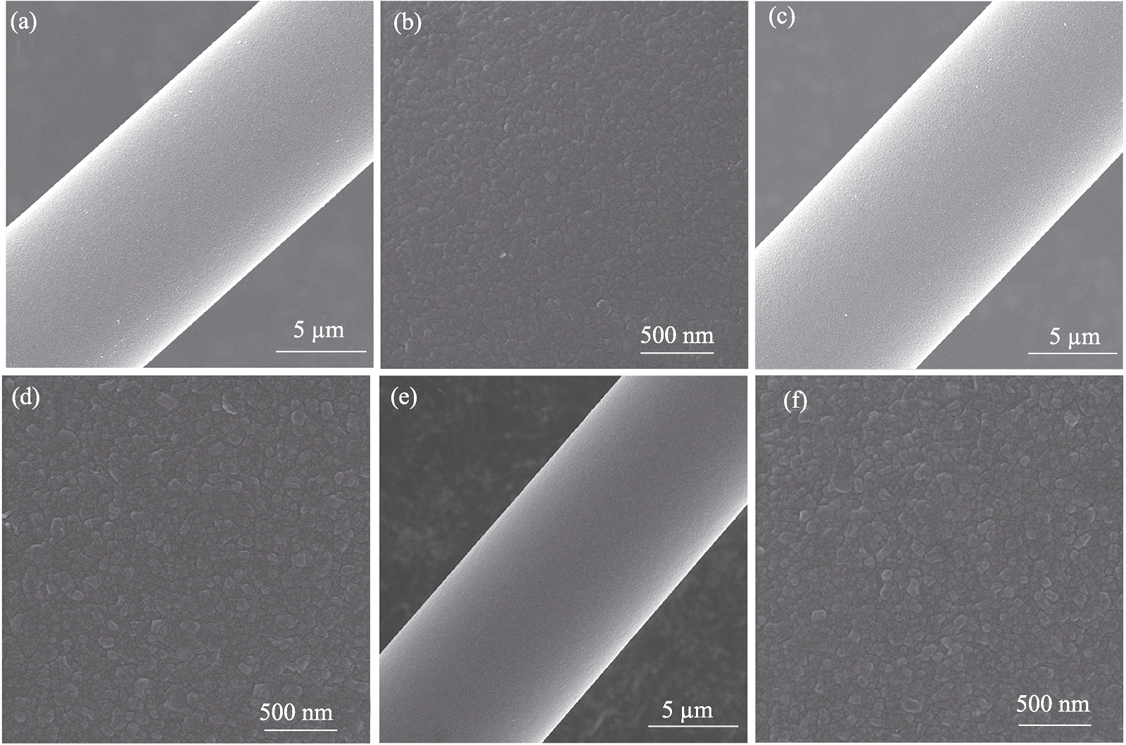 Fig. 2 Surface morphologies of the sintered SiC (SF) fibers (a, b) SiC (SF)-1600-1 h; (c, d) SiC (SF)-1800-1 h; (e, f) SiC (SF)-2000-1 h