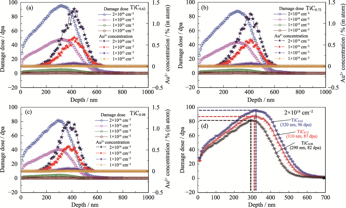 Fig. 1 (a-c) Damage dose and Au2+ concentration profiles induced by 3 MeV Au2+ irradiation in (a) TiC0.62, (b) TiC0.72, and (c) TiC0.98 at various fluences; (d) Damage dose profiles of samples at a fluence of 2×1016 cm-2 Colorful figures are available on website