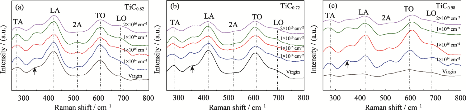 表S1 制备态及不同辐照通量辐照后TiCx薄膜的拉曼光谱峰位