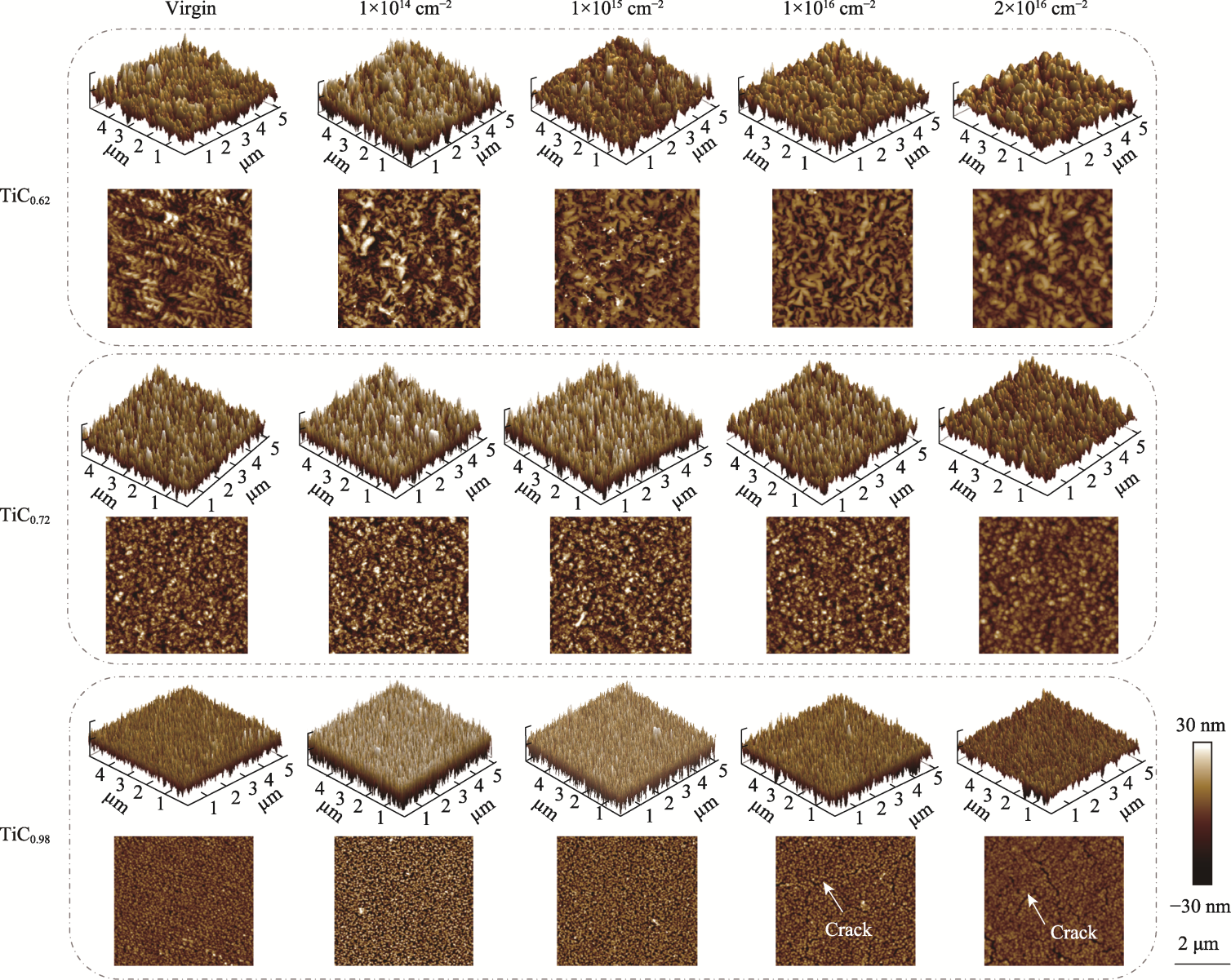 Fig. 3 Surface two-dimensional morphologies and three-dimensional morphologies obtained by AFM of as-deposited and irradiated TiCx films with various fluences