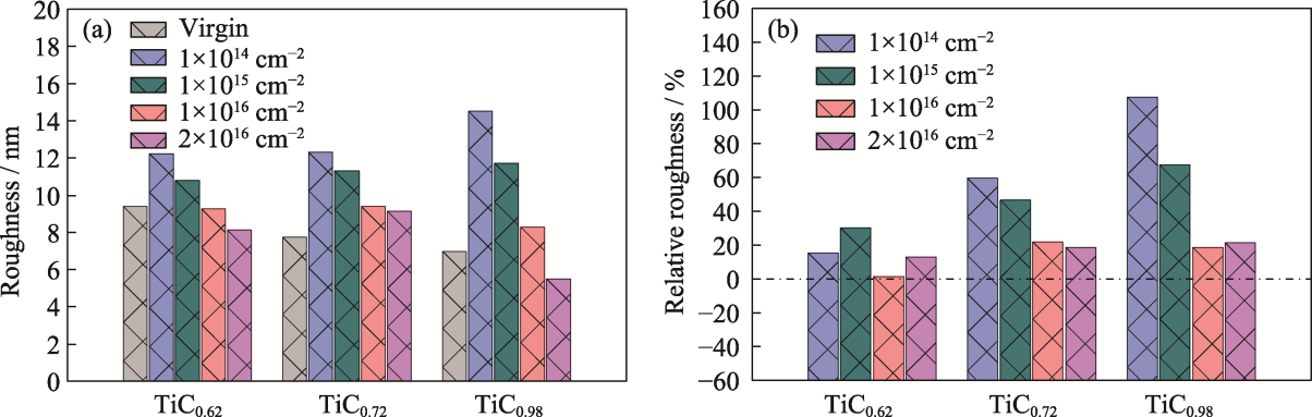 Fig. 4 (a) Roughness and (b) relative roughness of TiCx films under different fluences Colorful figures are available on website