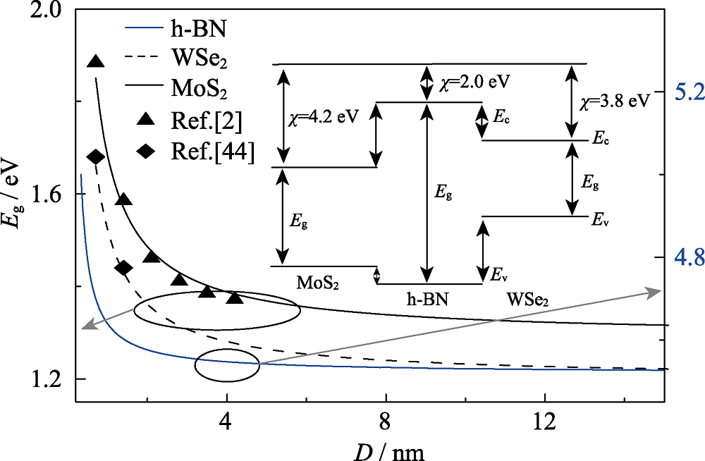 为探索界面工程对二维材料范德华异质结构中载流子复合率的影响, 本工作基于界面键弛豫理论和费米黄金定则, 建立了范德华异质结俄歇和层间复合率与各结构组元尺寸之间的理论模型。结果表明, MoS2/WSe2异质结的俄歇复合寿命随着组元尺寸的增大而增加, 且异质结的俄歇复合率远小于相应的单组元体系。在MoS2/WSe2双层异质结中引入薄h-BN插层后, 体系的层间复合率和俄歇复合率随h-BN厚度的增加而分别呈现减小和增大的趋势; 在组元处于单层MoS2和WSe2情况下, 当界面插层h-BN厚度达到9.1 nm时, 俄歇复合率将趋于5.3 ns -1。该研究结果为二维过渡金属硫族化合物基异质结光电器件的优化设计提供了一种理论依据。