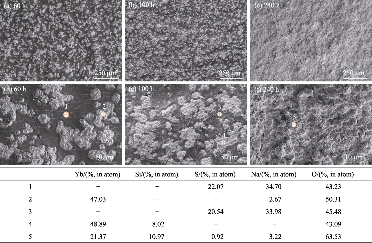 Fig. 4 Surface morphologies of Yb2SiO5/Yb2Si2O7/Si coating after molten salt corrosion for different time and correponding EDS analyses of different areas (a-c) Low magnification; (d-f) High magnification
