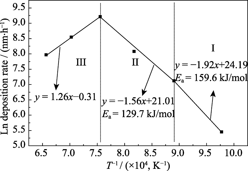 Silicon nitride coatings on carbon fiber cloth were prepared by Low Pressure Chemical Vapor Deposition (LPCVD) from gas mixtures of SiCl4-NH3-H2 at temperatures ranging from 750 ℃to 1250 ℃. The effects of deposition temperature on the growth kinetics, morphologies, chemical composition and bonding state of the coatings were investigated. The results showed that deposition rate increased monotonously with temperature up to 1050 ℃, then it reversely decreased. In the whole temperature range, the coating surface morphology became gradually coarse with cauliflower-like grains as the deposition temperature increased. The optimal deposition temperature for infiltration was in the range between 750 and 950 ℃. Chemical composition analysis demonstrated that the nitrogen content of the coating firstly decreased and then increased with temperature increase, while the silicon content continuously increased and the oxygen content gradually decreased in the whole temperature range. Heat treatment at 1300 ℃ and above crystallized the coating. Concurrently, a significant change in its surface morphology was observed. All heat-treated coatings were exclusively composed of a-Si3N4, without the presence of any b-Si3N4.