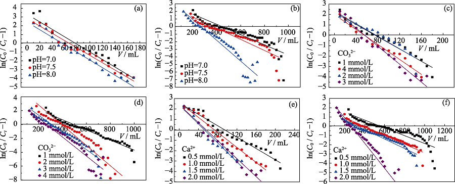 | pH | CO32- /(mmol·L-1) | Ca2+ /(mmol·L-1) | Thomas model | Yoon-Nelson model | |||||