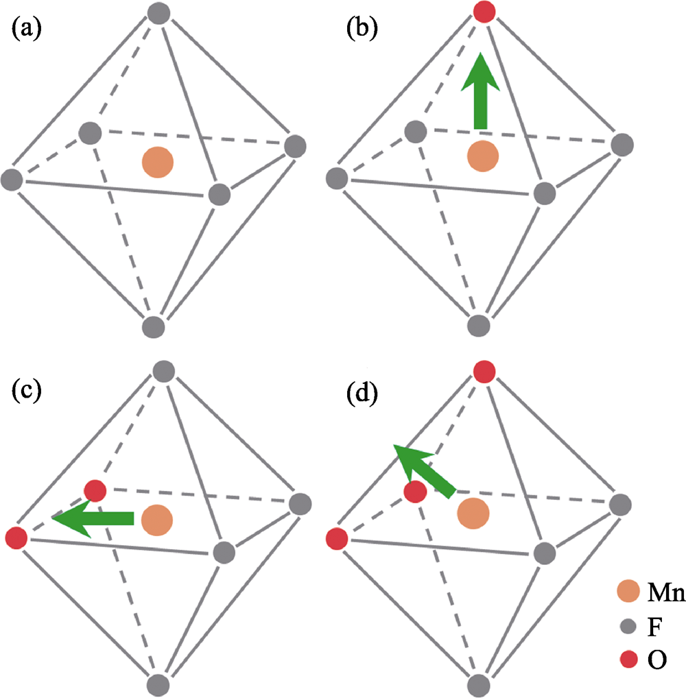 Fig. 2 Regular octahedron coordination and distorted octahedra coordination (a) Point symmetry of Oh; (b) Central cation shifting to a vertex, C4v; (c) Central cation shifting to an edge, C2v; (d) Central cation shifting to a face, C3v
