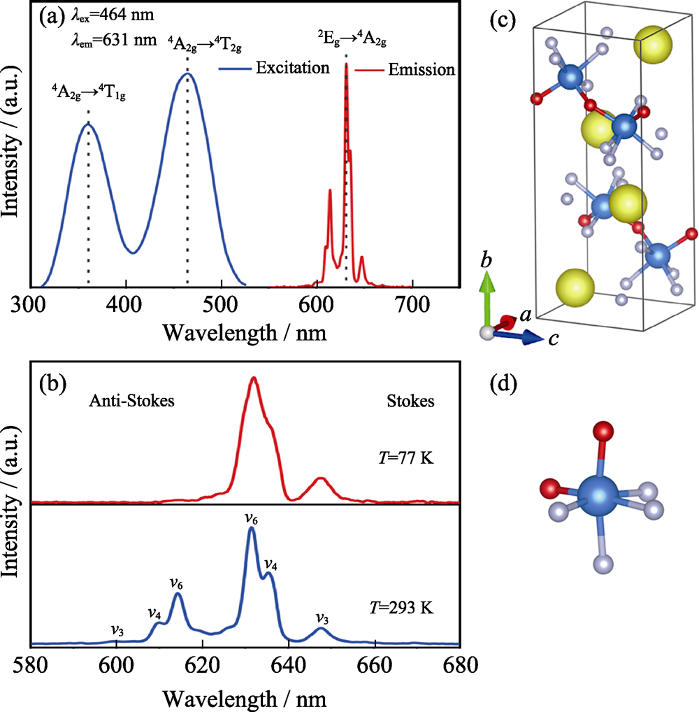 Fig. 8 Excitation and emission spectra of BaTiOF4:Mn4+ at room temperature (a), emission spectra of BaTiOF4:Mn4+ at 77 K and 293 K (b), unit cell of BaTiOF4 (c), and distorted octahedron coordination of [Ti2OF4] (d)[28]Ba: yellow; Ti: blue; O: red; F: gray