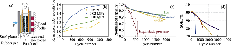 Fig. 19 (a) Experimental schematic diagram of the external constraint and EIS test[94]; (b) Impedance as a function of cycle times at different external pressures[95]; (c) Effect of external constraints on cycle lifetime of the cell, of which blue, green, yellow and red lines representing external constraints of 0, 0.05, 0.5 and 5 MPa, respectively[96]; (d) SOH as a function of cycle times, of which blue, red, yellow, and purple lines representing no external constraint, constant thickness constraint, elastic element constraint, and constant force spring constraint, respectively[97]
