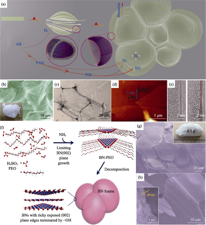 Fig. 9 (a) Synthesis scheme, (b) SEM, (c) optical, (d) AFM and (e) HRTEM images of BN foam by foaming of AB[29]; (f) Synthesis scheme and (g, h) SEM images of BN foam using boric acid and PEO[97]