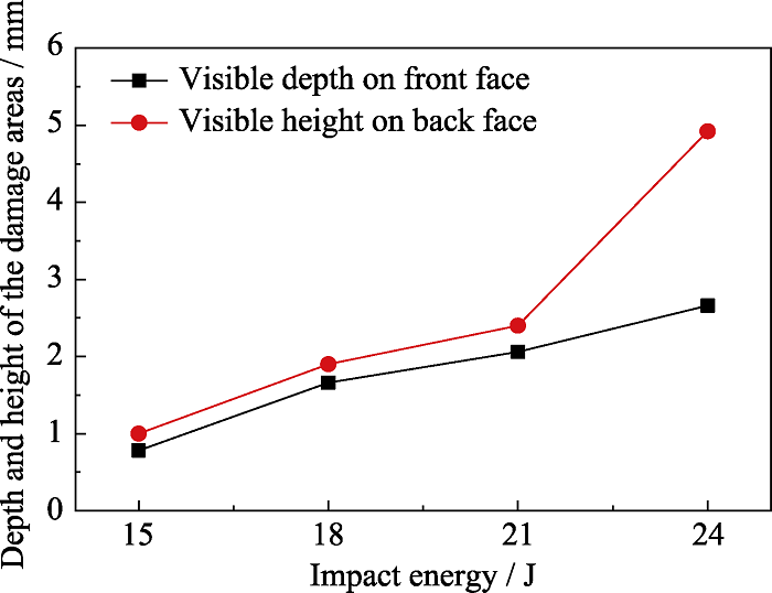 | Impact energy/J | Front damage area/mm2 | Front damage depth/mm | Back damage area/mm2 | Back damage height/mm | Residual tensile strength /MPa |