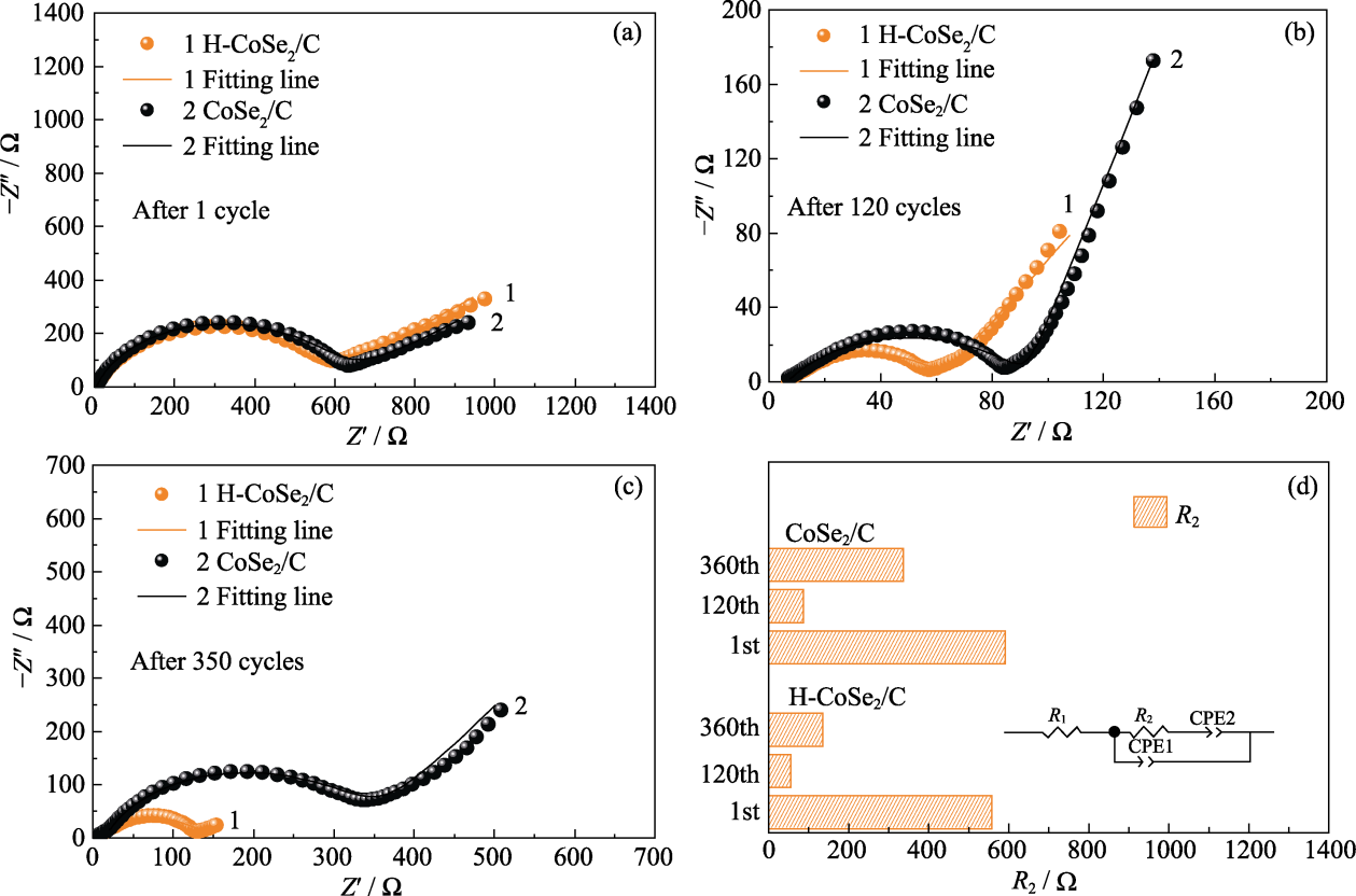 Fig. S5 EIS spectra of H-CoSe2/C and CoSe2/C after (a) 1 cycle, (b) 120 cycles, and (c) 350 cycles and (d) corresponding histogram of R2 with inset showing equivalent circuit model