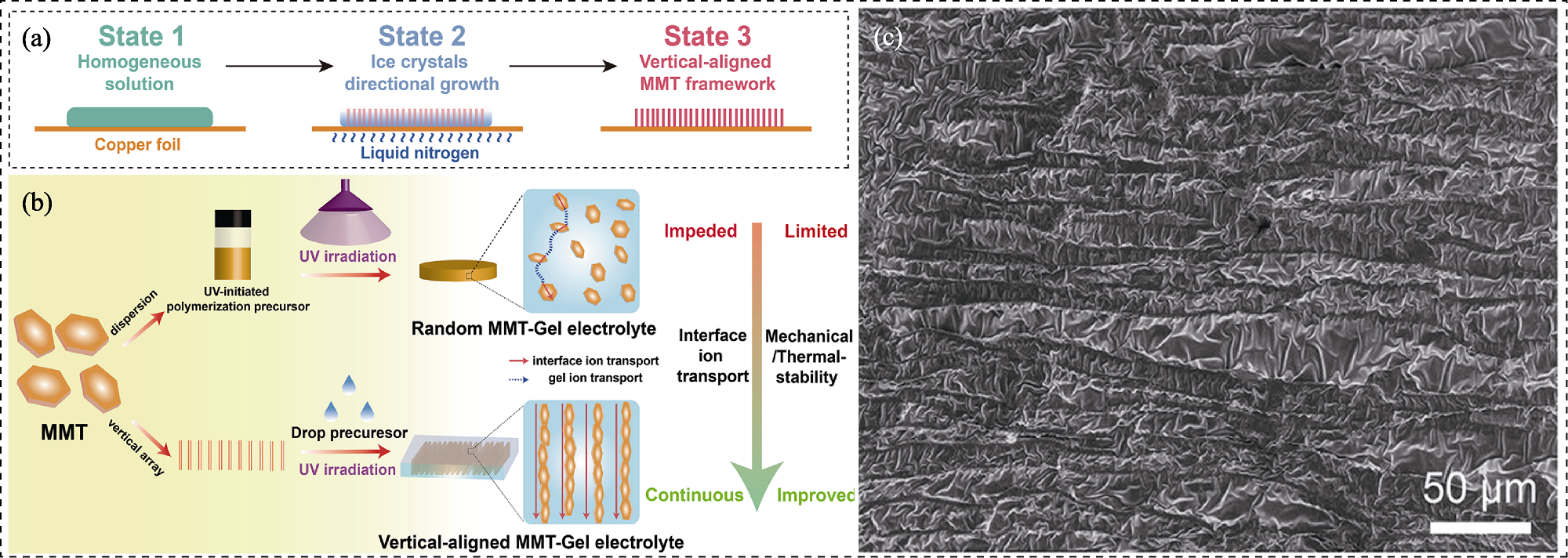 Fig. 6 Directional ion transport pathways constructed by vertically arranging bentonite nanosheets in gel polymer electrolytes (GPEs)[75] (a, b) Schematic illustration of (a) vertical-aligned montmorillonite prepared by directional freezing technology and (b) fabrication process of GPEs with/without vertical-aligned ion pathways; (c) Top view SEM image of the ion-conducting arrays GPEs