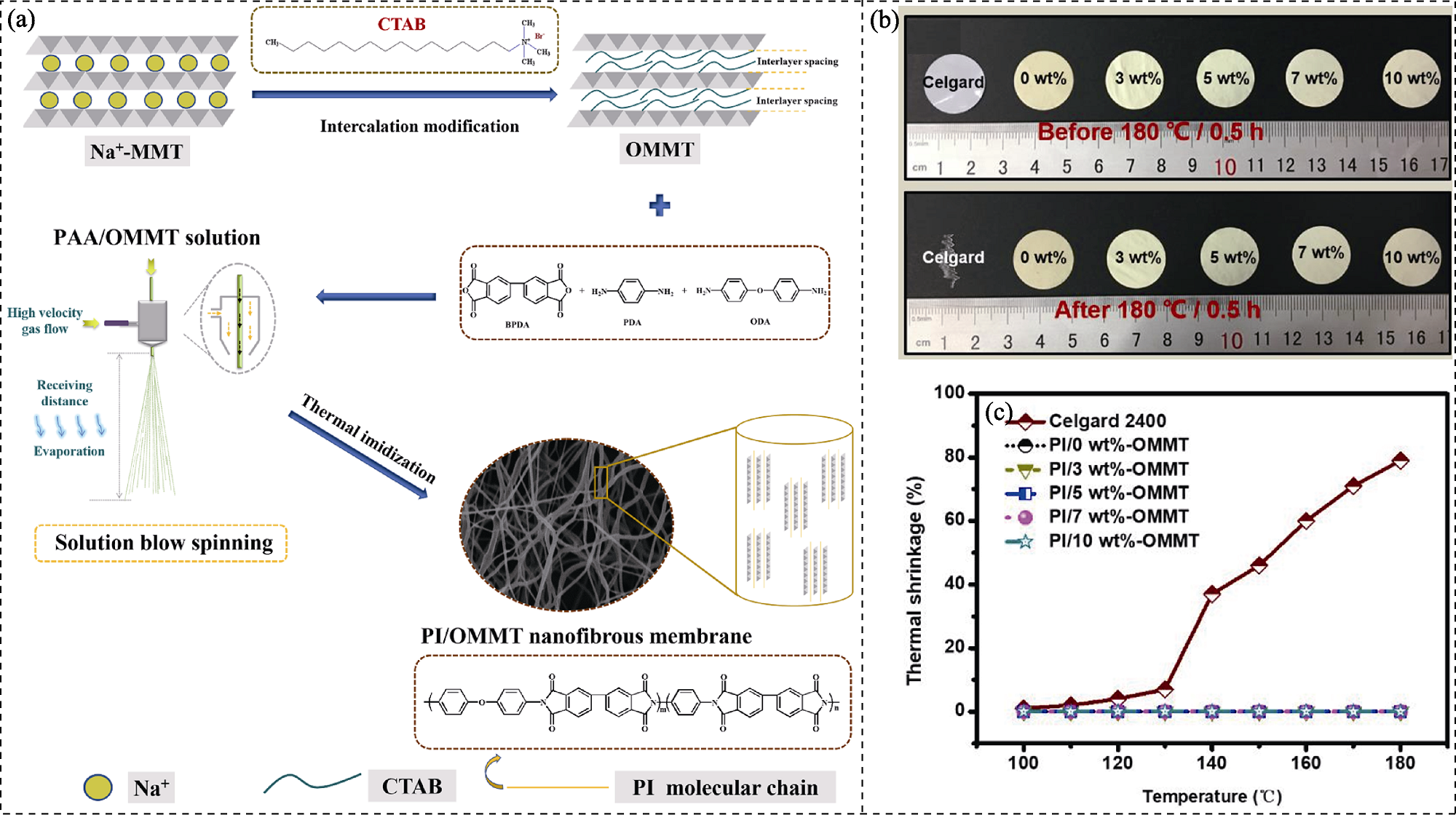 Fig. 7 Preparation process and thermostability of bentonite-based functional material filling modified polymer separator[93] (a) Preparation of organic-montmorillonite (OMMT) via the intercalation modification of Na-montmorillonite (Na-MMT) by hexadecyl trimethyl ammonium bromide (CTAB) and preparation of polyimide (PI)/OMMT nanofibrous membrane via the thermal imidization of polyamide acid (PAA)/OMMT; (b) Photographs of Celgard 2400 and PI/OMMT hybrid separators before and after exposure to 180 ℃ for 0.5 h and (c) the corresponding thermal shrinkage changes at different OMMT mass fractions of 0, 3%, 5%, 7%, and 10% (denoted as PI/0 wt%-OMMT, PI/3 wt%-OMMT, PI/5 wt%-OMMT, PI/7 wt%-OMMT, and PI/10 wt%-OMMT, respectively)