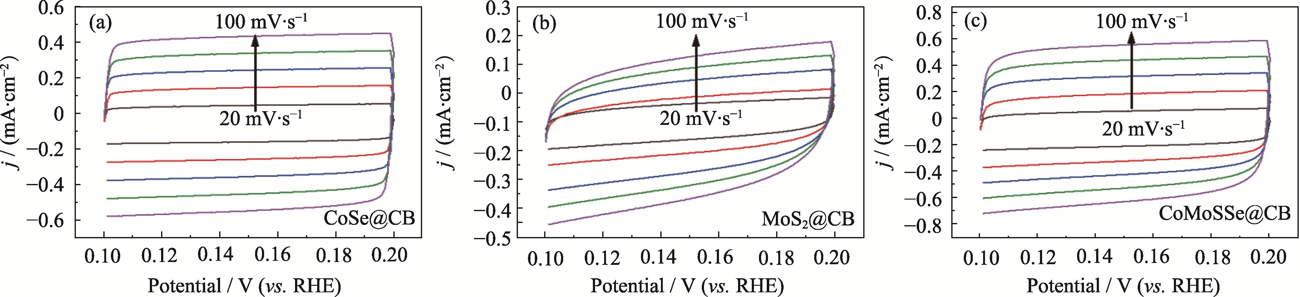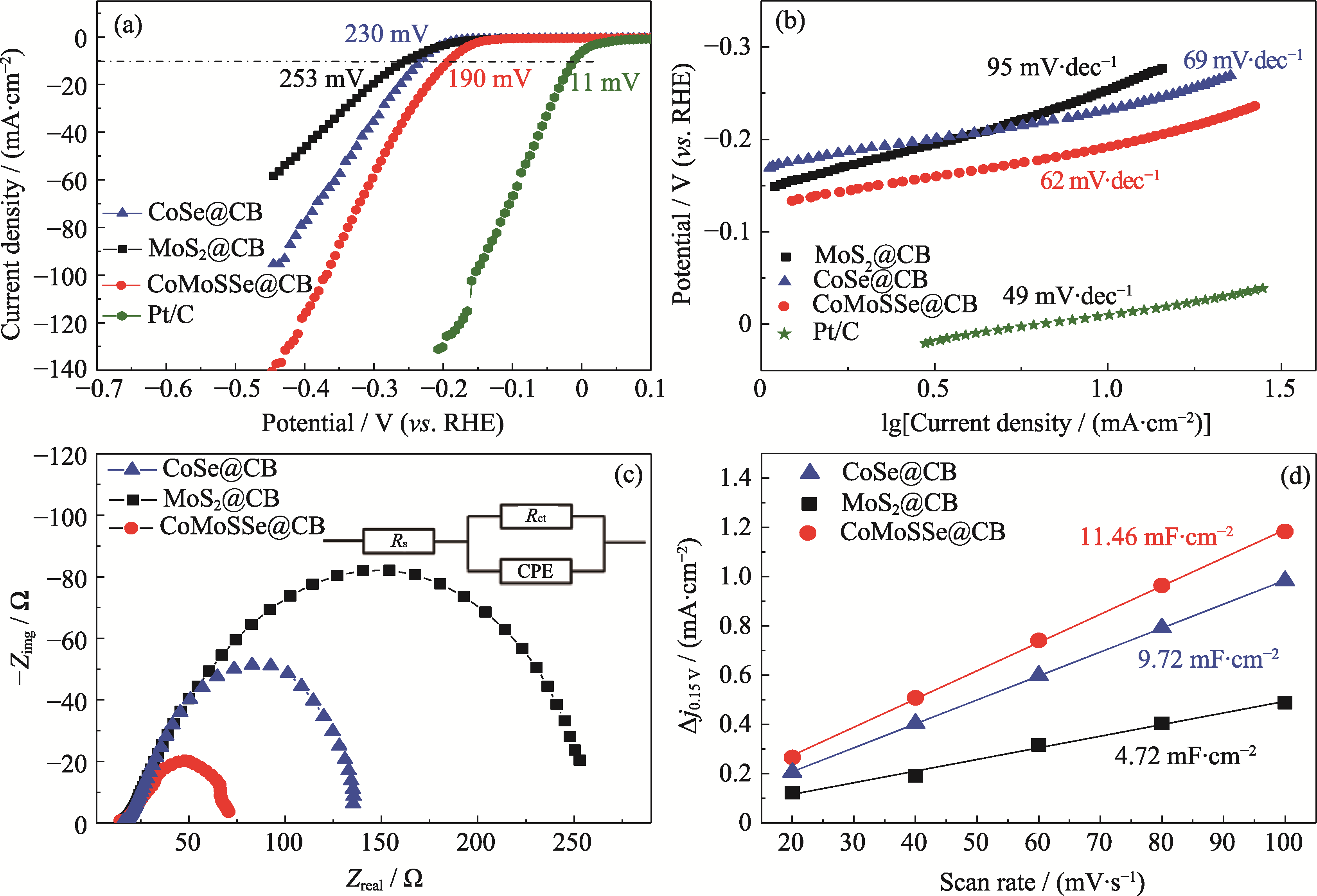 Fig. 5 HER performances of different catalysts (a) LSV curves and (b) corresponding Tafel plots obtained from CoSe@CB, MoS2@CB, CoMoSSe@CB, and Pt/C catalysts in 0.5 mol·L-1 H2SO4 at a scan rate of 5 mV·s-1; (c) EIS spectra at 0.4 V (vs. RHE) for CoSe@CB, MoS2@CB and CoMoSSe@CB electrodes with inset showing equivalent circuit; (d) Cdl of the electrocatalysts obtained by CV in non-Faradic potential window