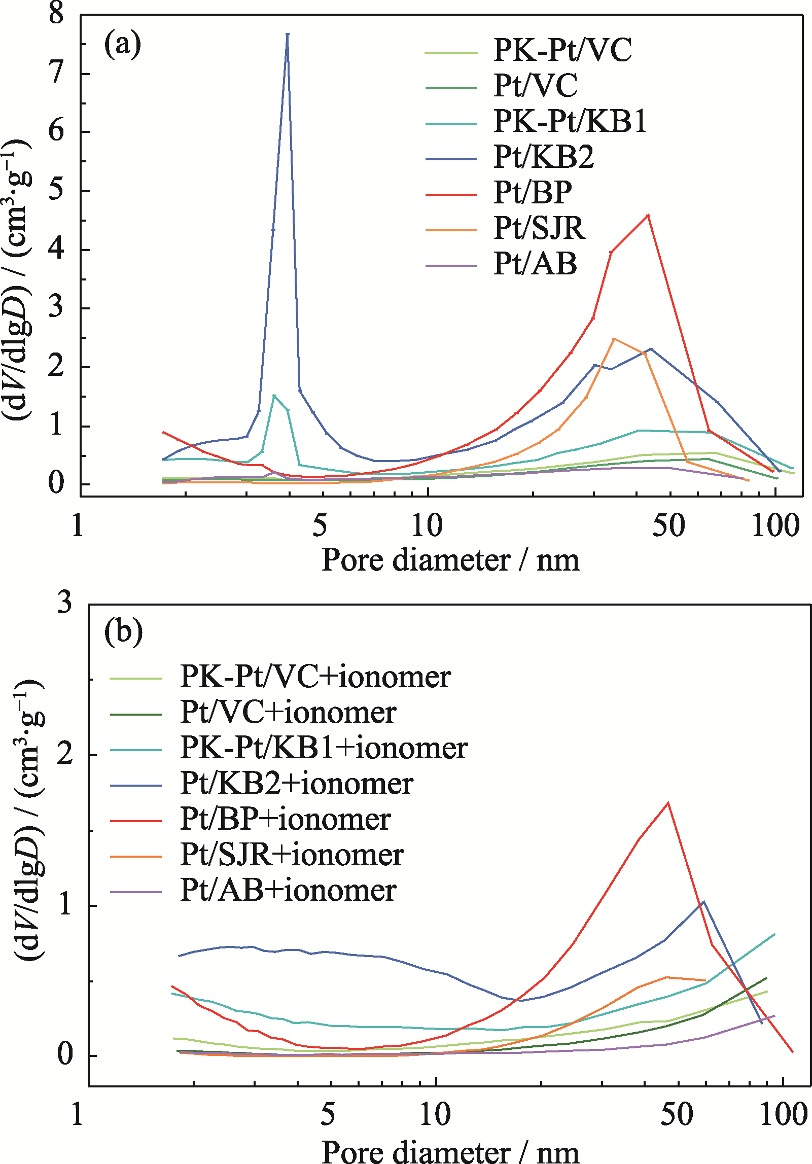 Fig. 5 Pore size distribution curves of different Pt/C catalysts (a) before and (b) after addition of ionomer Colorful figures are available on website