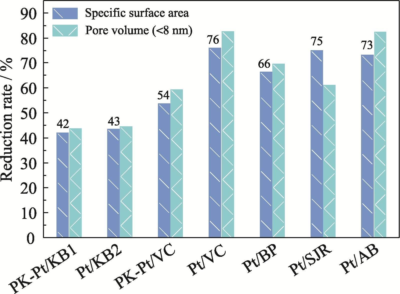 Fig. 6 Reduction rates of specific surface areas and pore volumes of different Pt/C catalysts after addition of ionomer Numbers in the figure represent coverages of ionomer