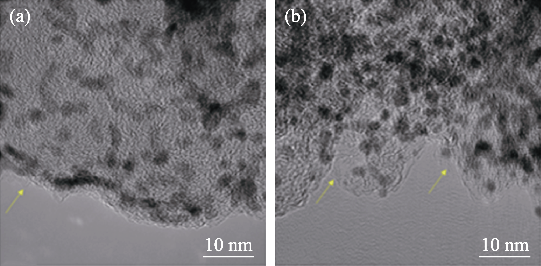 Fig. 7 TEM images of catalysts containing ionomer for (a) Pt/VC and (b) Pt/KB2 Yellow arrows: ionomer film covering the outer surface of the catalyst particles
