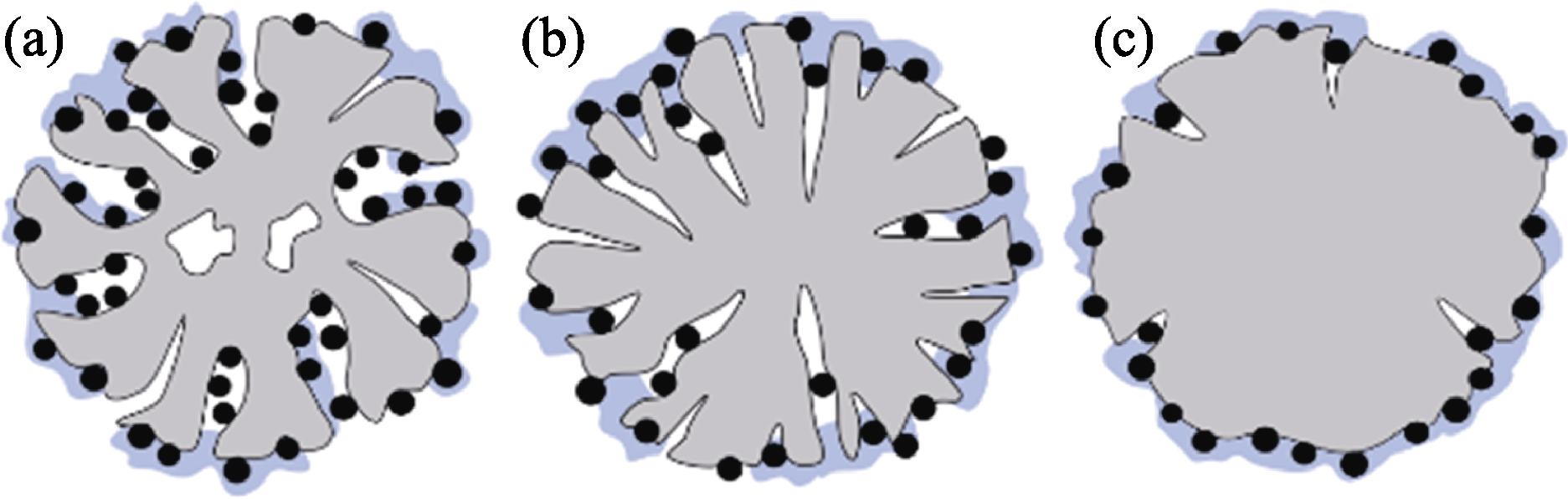 Fig. 8 Schematic diagrams of the coverage states of ionomer on catalysts with different characteristics (a) PK-Pt/KB1, Pt/KB2; (b) Pt/BP; (c) Pt/VC, Pt/SJR and Pt/AB Black dot: Pt particle; Blue area: ionomer; Gray area: C