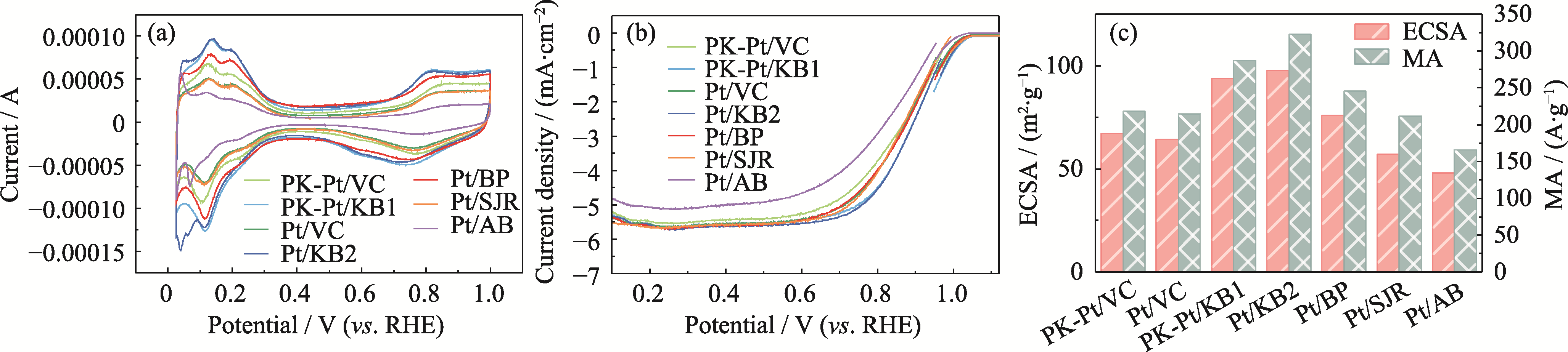 | Catalyst | PK-Pt/VC | Pt/VC | PK-Pt/KB1 | Pt/KB2 | Pt/BP | Pt/SJR | Pt/AB |