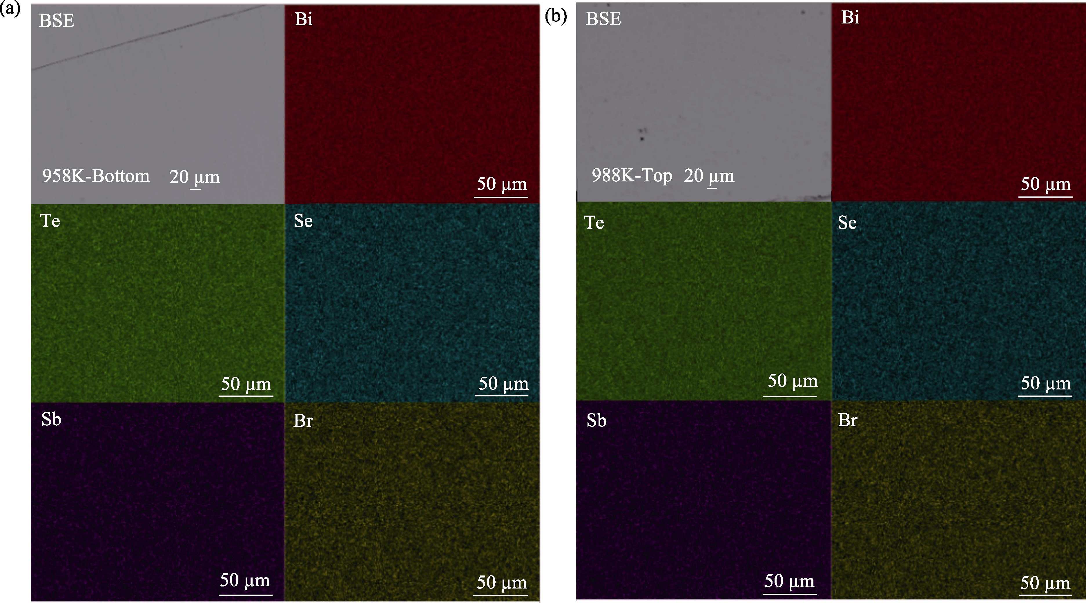 Fig. S2 BSE images of polished surface and surface distributions of Bi, Sb, Se, Te and Br elements in the corresponding regions for (a) 958 K-Bottom and (b) 988 K-Top