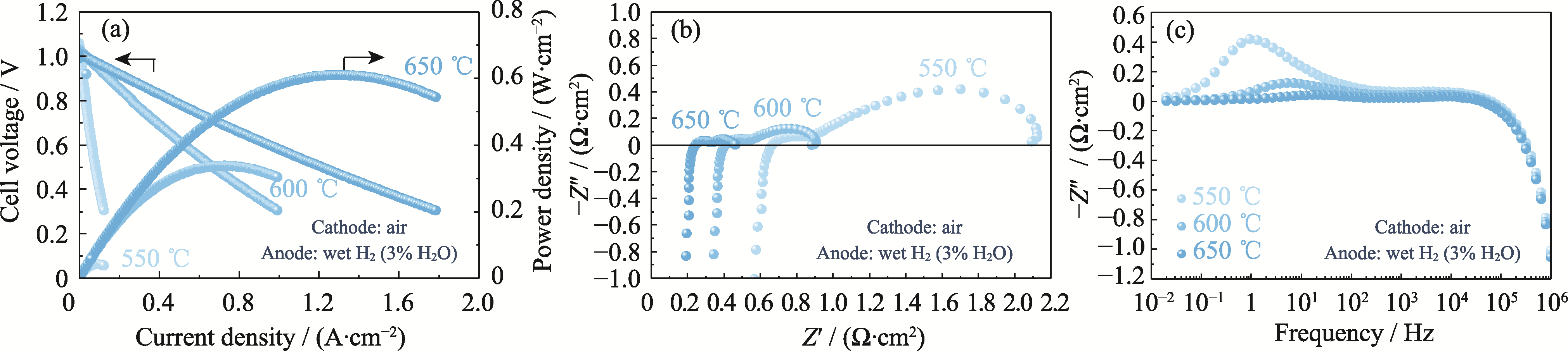 Fig. 7 Electrochemical performance of single cell with O-SSF-SDC cathode (a) I-V-P curves; (b) Nyquist curves; (c) Frequency vs. imaginary part of EIS spectra Colorful figures are available on website