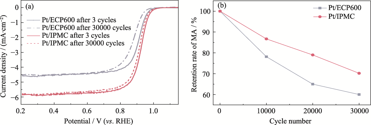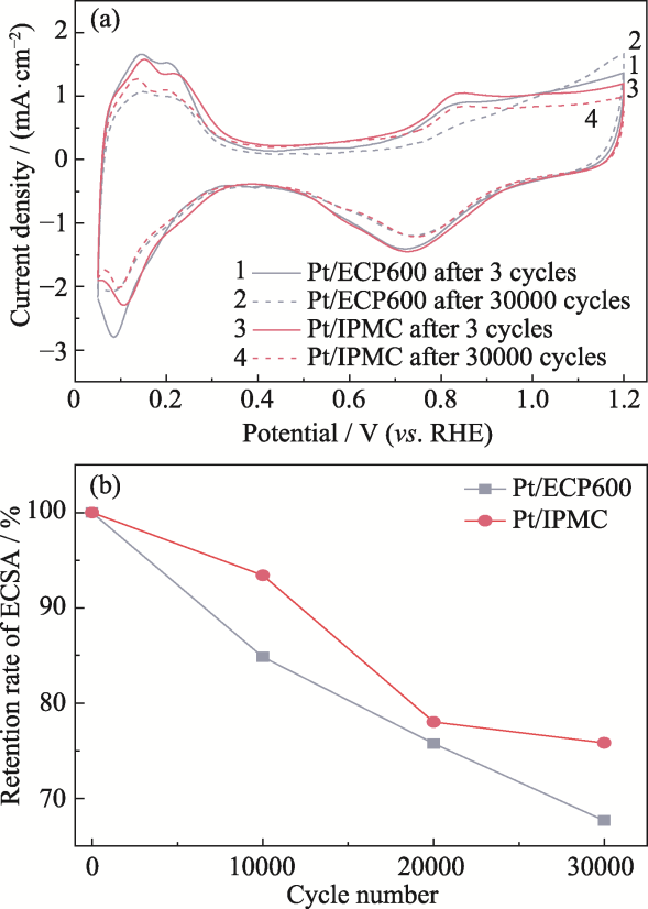 | Pt/ECP600 | 99 | 67.67% (after 30000 cycles) | 2.62→3.41 | 0.1 mol·L-1 HClO4, 0.6-0.1 V, 100 mV·s-1 |