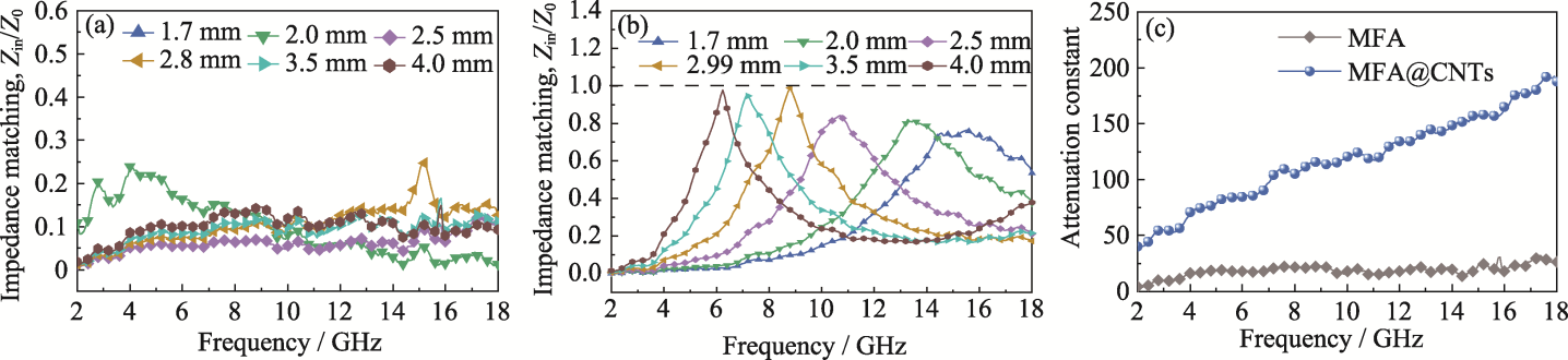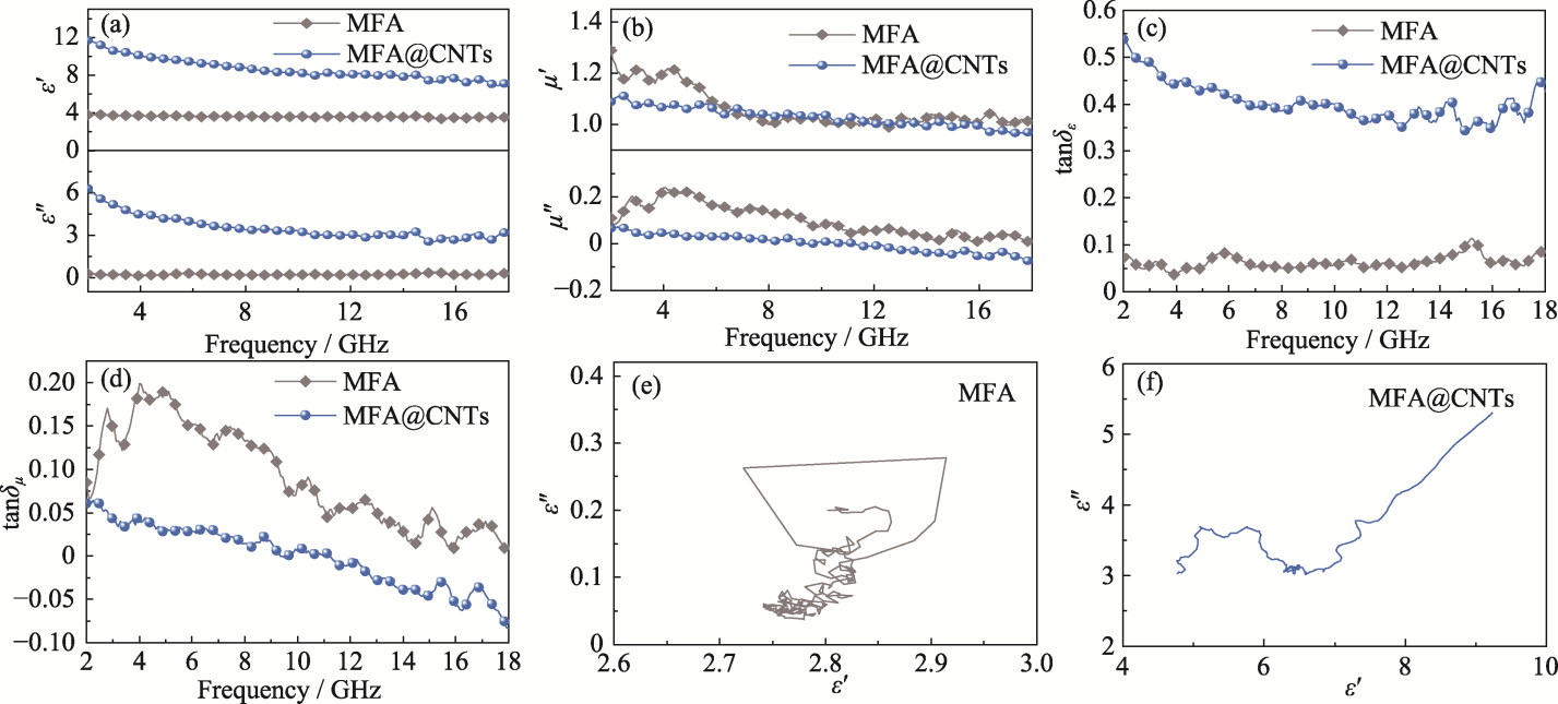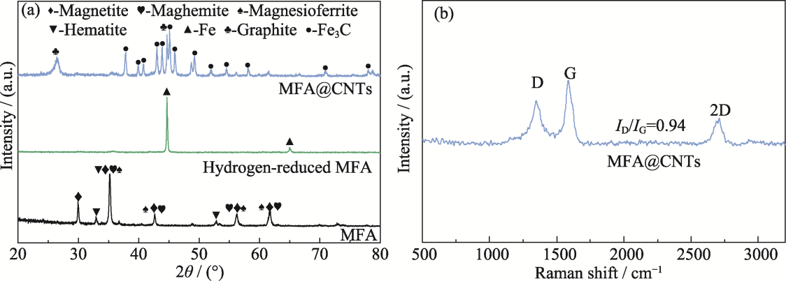 With rapid development of 5G communication and miniaturization of electronic devices, development of lightweight, broadband and high-efficiency electromagnetic wave absorbing materials has emerged as a critical solution to challenges posed by electromagnetic pollution and information leakage. However, traditional absorbing materials face significant limitations, such as high density, narrow absorption bandwidth and poor environmental compatibility, while the resource utilization of industrial solid waste provides an innovative path for the design of high-performance absorbing materials with both economic and ecological benefits. Here, magnetic fly ash (MFA) microbeads were derived from solid waste of coal-fired power plants through magnetic separation. Additionally, magnetic fly ash microbeads@carbon nanotubes (MFA@CNTs) composite wave-absorbing materials with a three-dimensional interpenetrating network structure were successfully prepared by chemical vapor deposition (CVD) using in situ-loaded Fe-based nanoparticles on surface of the MFA microbeads as catalysts. Microstructural characterization showed that the bamboo-like CNTs grown on surface of the MFA microbeads formed a porous structure by inter tubular winding and bridging with silicate framework. The composite material achieves a minimum reflection loss (RLmin) of -44.52 dB at 8.8 GHz (with a thickness of 2.99 mm) and an effective absorption bandwidth (EAB, RL<-10 dB) covering 4.72 GHz (with a thickness of 1.7 mm). The performance enhancement mechanism can be attributed to the following aspects. (1) The magnetic component (Fe3O4) in the MFA microbeads interacts with conductive network of the CNTs, thereby establishing a magneto-electrical coupling effect to optimize the impedance matching. (2) The defective structure of bamboo-like CNTs induces multiple polarized relaxation (including interfacial and dipole polarizations), significantly enhancing the dielectric loss. (3) The 3D porous network extends the propagation path of electromagnetic wave, thereby promoting multiple reflection and scattering loss. This study not only provides a new paradigm for high-value utilization of industrial solid waste, but also lays a theoretical and technical foundation for the design of lightweight and broadband wave-absorbing materials.