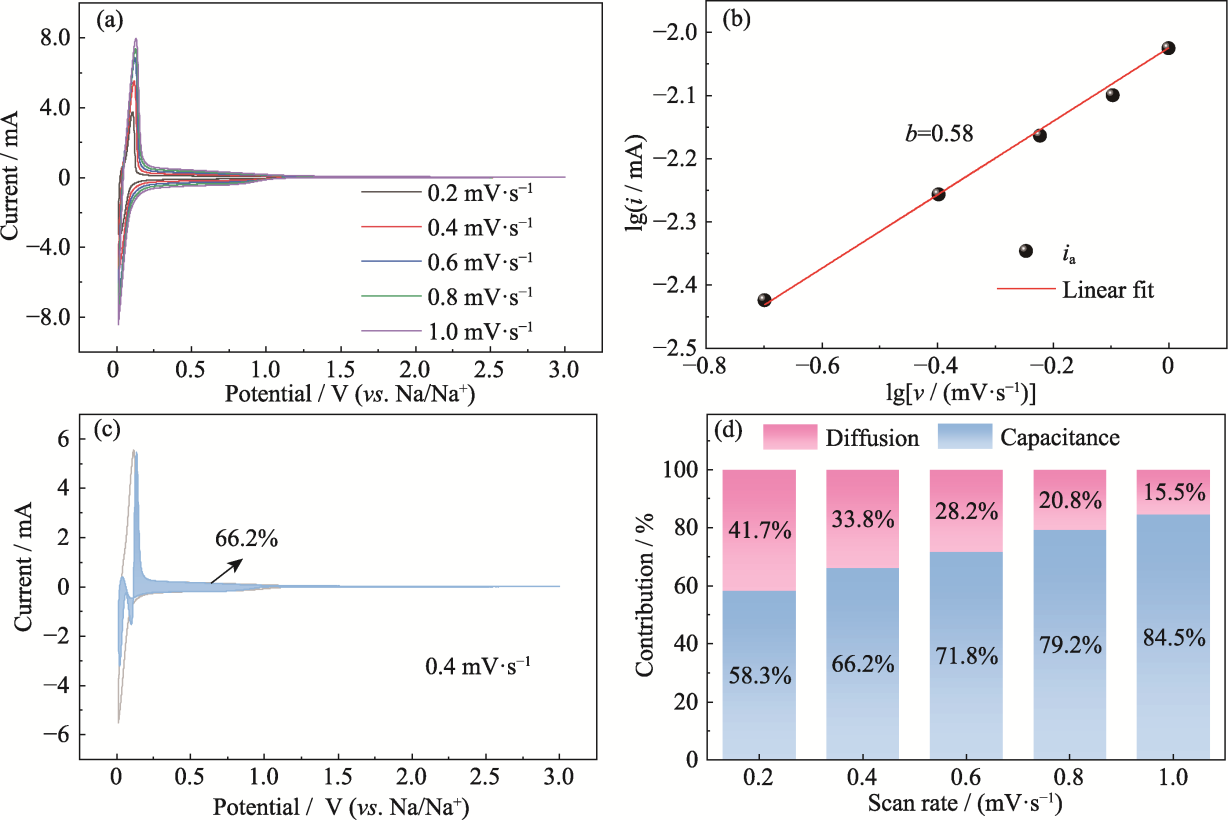 Fig. 8 Dynamic analysis of B@N@NHCS-900 (a) CV curves from 0.2 to 1.0 mV·s-1; (b) Fitting line of scan rate and peak current; (c) Capacitive contribution at 0.4 mV·s-1; (d) Ratios of diffusion and capacitance contributions at different scan rates. Colorful figures are available on website