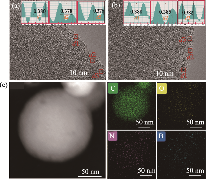 Fig. 3 (a, b) HRTEM images of (a) NHCS-900 and (b) B@N@NHCS-900 with inserts showing the corresponding FFT patterns for measuring the interlayer distance in square areas; (c) STEM image and C, O, N and B element mappings of B@N@NHCS-900