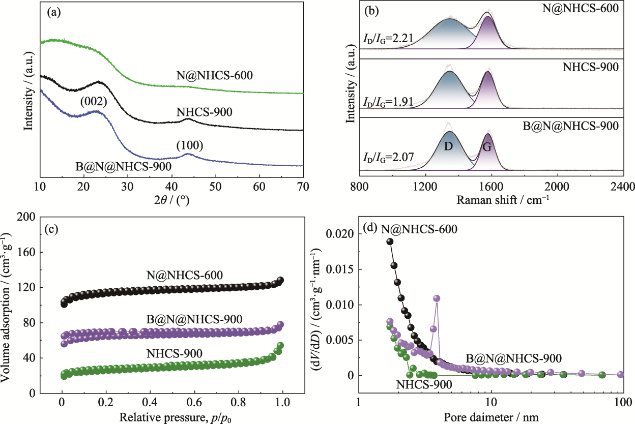 Fig. 4 (a) XRD patterns, (b) Raman spectra, (c) N2 adsorption-desorption isotherms and (d) pore size distributions of N@NHCS-600, B@N@NHCS-900 and NHCS-900