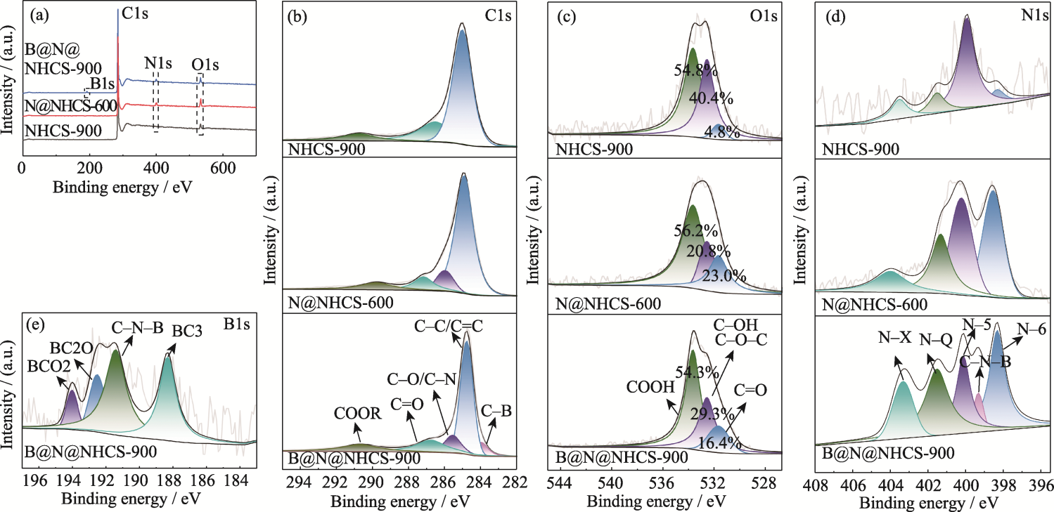 Fig. 5 (a) XPS survey spectra, high resolution (b) C1s, (c) O1s and (d) N1s XPS spectra of N@NHCS-600, B@N@NHCS-900 and NHCS-900; (e) High resolution B1s XPS spectrum of B@N@NHCS-900
