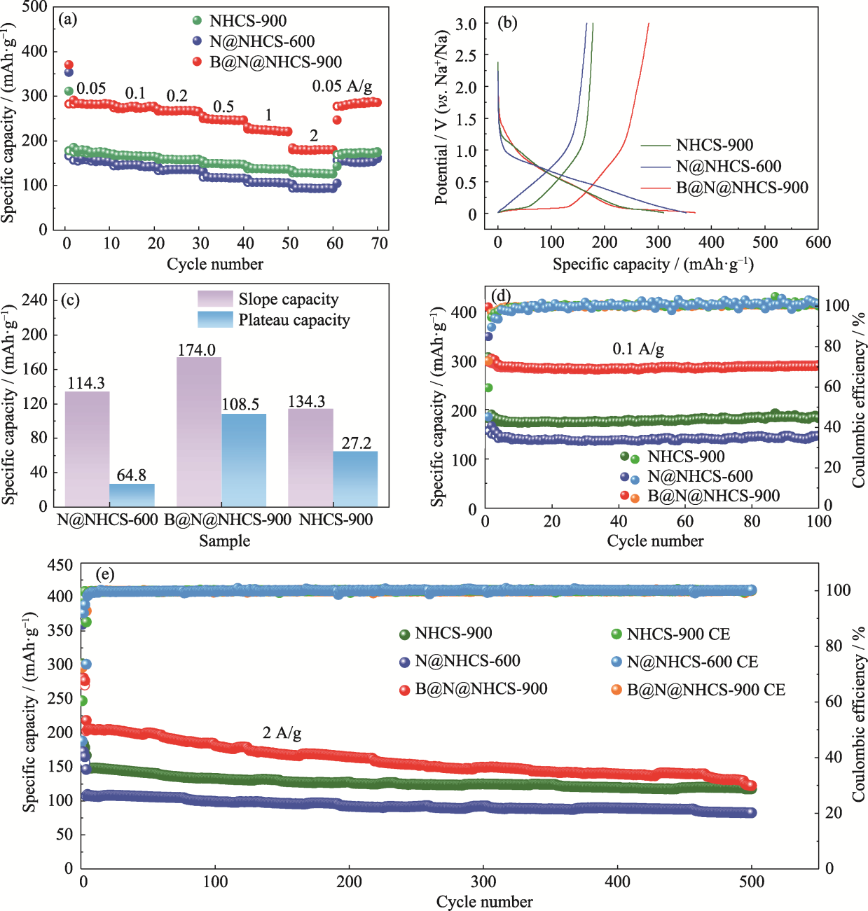 Fig. 7 Electrochemical properties of N@NHCS-600, B@N@NHCS-900 and NHCS-900 (a) Rate capability; (b) First charge-discharge curves at a current density of 0.05 A·g-1; (c) Capacity contribution of the slope/plateau region in the 2nd discharge curves; (d, e) Cycling performance at (d) 0.1 and (e) 2 A·g-1. Colorful figures are available on website
