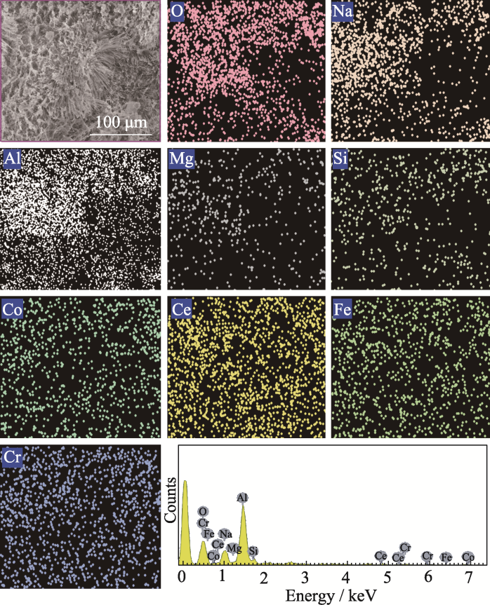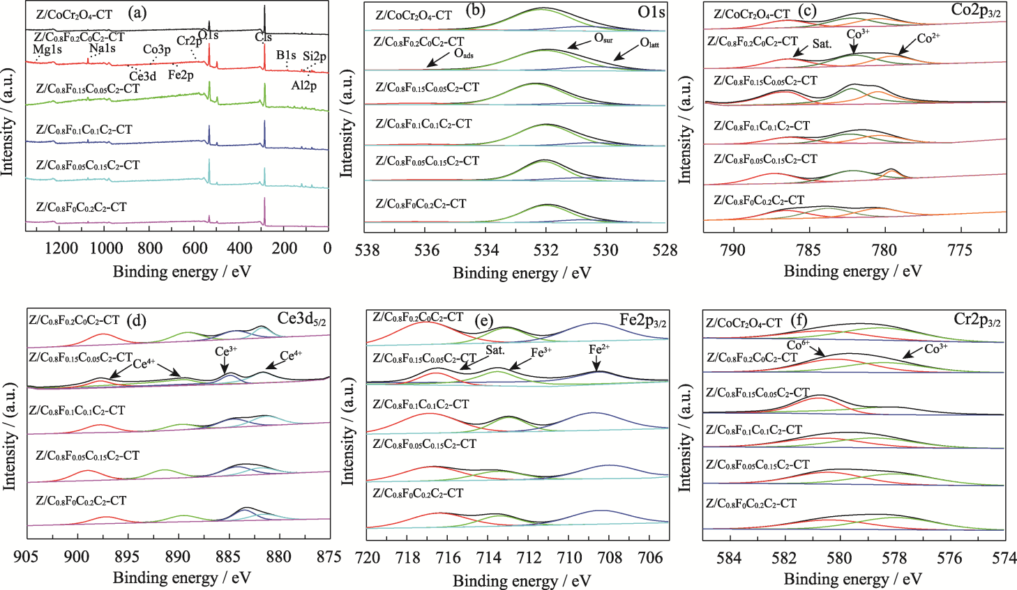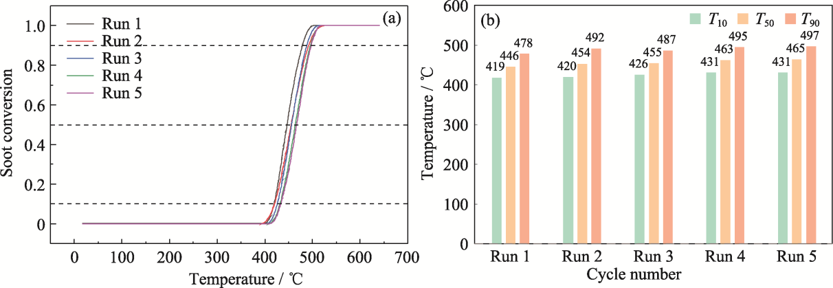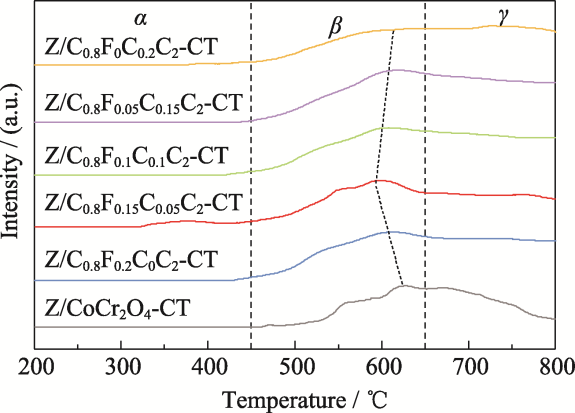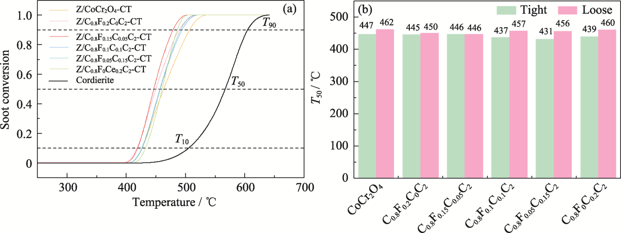 With increasingly strict regulations on exhaust emissions, the higher requirements have been built for filtration of diesel particulate filter (DPF) because traditional DPF cannot meet the demand for precise filtration of nanoparticles in exhaust. In this study, a series of Co0.8FexCe0.2-xCr2O4 spinel-type catalysts were loaded on aluminum borate whiskers by hexadecyl dimethyl ammonium bromide (CTAB)-assisted co-precipitation method. The unique hierarchical microstructure design of “whisker enhanced filter-bimetallic doping catalytic oxidation” achieves a combination of efficient filtration performance and low-temperature catalytic performance, enabling catalytic oxidation of carbon soot particles at lower temperatures. Fe and Ce co-doping produces significant synergistic effects, increasing concentrations of oxygen species (oxygen vacancies), Co3+ and Cr6+ on the catalyst surface and enhancing reaction activity. Temperature of carbon soot particles at 50% conversion (T50=446 ℃) is significantly lower than that of the blank cordierite sample (T50=567 ℃). Five cyclic stability tests show that the catalysts have good stability and CO2 selectivity (86%-94%). In conclusion, this unique hierarchical microstructure exhibits a unity of efficient particle filtration and low temperature catalytic combustion performance, with potential application in the field of DPF.