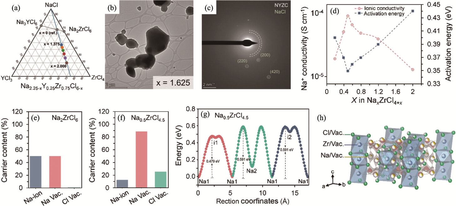 Fig. 4 Phase diagram, ion transport properties and structures of Na3-xMCl6-x/Na2-xMCl6-x solid electrolytes[36,59] (a) Phase diagram of NaCl-YCl3-ZrCl4[59]; (b) Transmission electron microscope image of Na0.625Y0.25Zr0.75Cl4.375[59]; (c) Selected area electron diffraction pattern of Na0.625Y0.25Zr0.75Cl4.375[59]; (d) Ionic conductivity and activation energy of NaxZrCl4+x at 25 ℃[36]; (e, f) Na+ and vacancy contents in (e) Na2ZrCl6 and (f) Na0.5ZrCl4.5[36]; (g) Energy profiles along the Na+ transport pathways in Na0.5ZrCl4.5[36]; (h) Crystal structure of Na0.5ZrCl4.5[36]