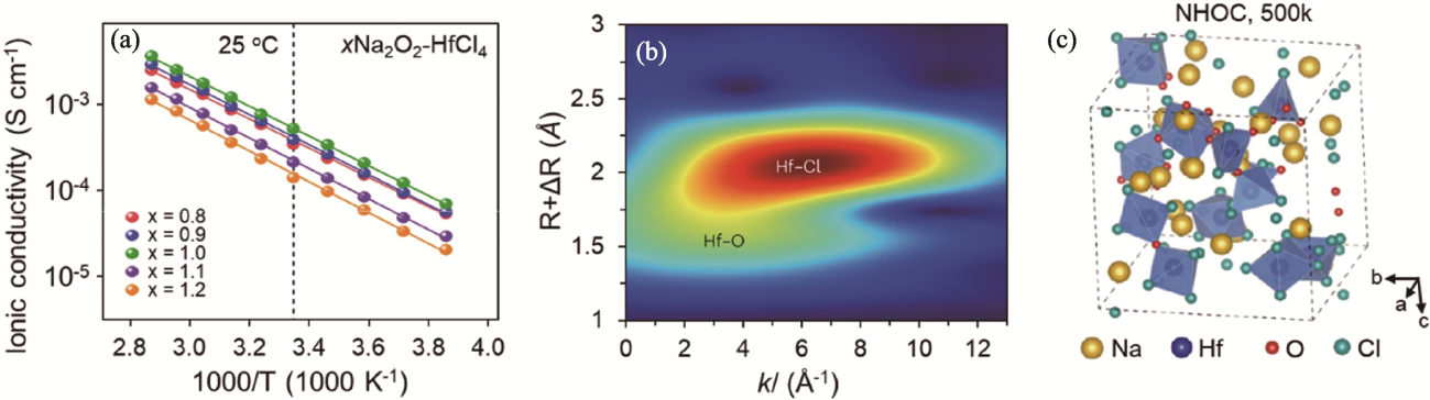 Fig. 5 Ion transport property and structure of xNa2O2-HfCl4 solid electrolytes[39] (a) Arrhenius plots of xNa2O2-HfCl4; (b) Wavelet-transformed EXAFS contour plots of Na2O2-HfCl4 at Hf L3-edge[39];(c) AIMD-generated structure of amorphous Na2O2-HfCl4 at 500 K[39]