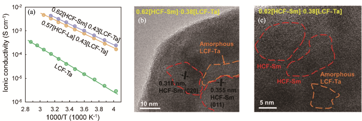 Fig. 6 Ion transport property and structure of xUCl3-(1-x)NaTaCl6 solid electrolytes[69] (a) Arrhenius plots of 0.62Na0.75Sm1.75Cl6-0.38NaTaCl6 and 0.57Na0.75La1.75Cl6-0.43NaTaCl6; (b, c) Transmission electron microscope images of 0.62Na0.75Sm1.75Cl6-0.38NaTaCl6