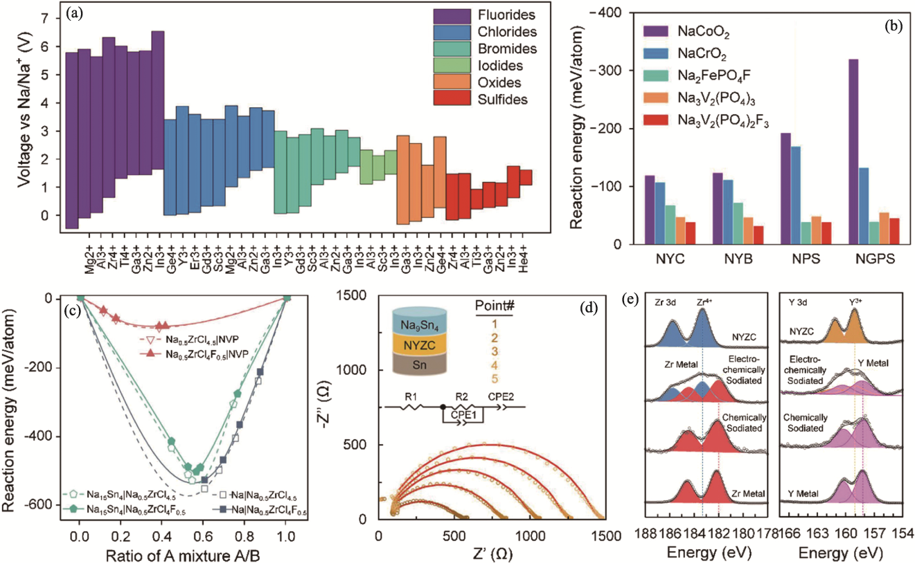 Fig. 7 Electrochemical stability of sodium chloride solid electrolytes and their compatibilities with electrode materials[36,71,74] (a) Calculated electrochemical stability windows of Na-M-X ternary compounds, including fluorides, chlorides, bromides, iodides, oxides, and sulfides[71]; (b) Calculated reaction energies between different cathodes and solid electrolytes for Na3YCl6 (NYC), Na3YBr6 (NYB), Na3PS4 (NPS), and Na10GeP2S12 (NGPS)[71]; (c) Calculated reaction energies between Na0.5ZrCl4.5, Na0.5ZrCl4F0.5 solid electrolytes and Na3V2(PO4)3 (NVP) cathode, Na anode and Na15Sn4 anode[36]; (d) Impedance evolution of Na9Sn4|Na2.25Y0.25Zr0.75Cl6|Na cells with the time increasing[74]; (e) Zr3d and Y3d XPS spectra of Na2.25Y0.25Zr0.75Cl6 obtained from Na9Sn4|Na2.25Y0.25Zr0.75Cl6|Na cells after charging and discharging[74]