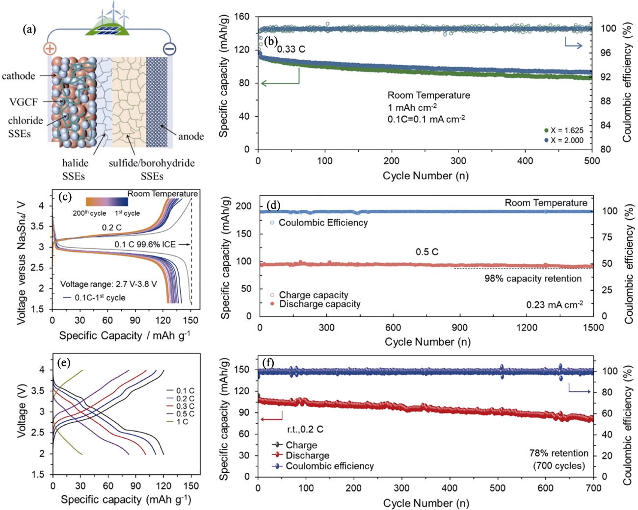 Fig. 8 Electrochemical performance of chloride all-solid-state sodium-ion batteries[36-37,39,59] (a) Schematic illustration of halide-based all-solid-state battery[36]; (b) Long cycling profiles of NaCrO2|Na2.25Y0.25Zr0.75Cl6|Na2(B10H10)0.5(B12H12)0.5|Na9Sn4 cells[59]; (c) Charge-discharge curves of Na3V2(PO4)3|NaTaCl6|Na3PS4|Na15Sn4 cells during cycling[37];(d) Long cycling profiles of Na3V2(PO4)3|NaTaCl6|Na3PS4|Na15Sn4 cells[37]; (e) Charge-discharge curves of Na0.85Mn0.5Ni0.4Fe0.1O2|Na2O2-HfCl4|Na3PS4|Na15Sn4 cells with different rate currents[39] and corresponding (f) long cycling profiles[39]