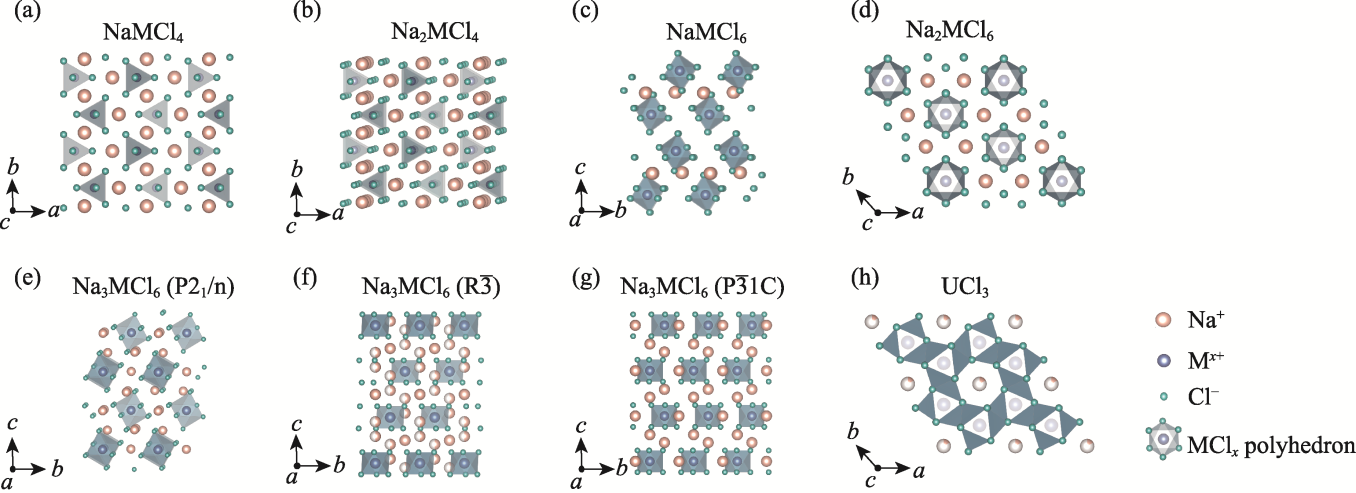 Fig. 2 Crystal structures of different sodium chloride solid electrolytes (a) NaMCl4; (b) Na2MCl4; (c) NaMCl6; (d) Na2MCl6; (e) Na3MCl6 (P21/n); (f) Na3MCl6 ($\text{R}\overline{3}$); (g) Na3MCl6 ($\text{P}\overline{3}1\text{c}$); (h) UCl3
