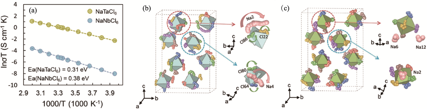 Fig. 3 Ion transport properties of NaMCl6 solid electrolytes[52] (a) Arrhenius plots of NaTaCl6 and NaNbCl6; (b, c) Atomic trajectories of Na and Cl atoms from ab initio molecular dynamics (AIMD) simulations for (b) NaTaCl6 and (c) NaNbCl6