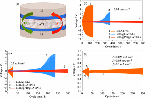 Li1.3Al0.3Ti1.7(PO4)3 (LATP), one of the NASICON-type solid-state electrolytes, possesses a high ionic conductivity, excellent chemical stability, and high shear modulus (40-60 GPa). However, the tetravalent titanium ion in LATP is particularly prone to undergo reduction reaction with lithium metal during cycling, leading to the structure degradation and electron introduction in LATP electrolyte. In order to maintain the chemical and electrochemical stability of LATP, this work modified the surface of LATP solid electrolyte with a Prussian blue (PB) interfacial layer to optimize the contact between electrolyte and anode. Using PB with abundant open-frame lithium ion diffusion channels as the mixed conductive modification layer has several advantages. (1) Intrinsic conductivity of PB layer is enhanced after lithiation, accelerating homogenized transmission of electrons from the interfacial layer to the negative electrode. (2) Lithiation process is accompanied by enhancing lithium affinity of PB intermediate layer, which enables the interface contact between LATP and lithium metal to be closer during the electrochemical process. (3) Lithiated PB still maintains a three-dimensional skeleton structure, which is conducive to the homogenization effect of lithium ion flux at interface, thereby promoting stabilization of lithium deposition/stripping process. (4) The PB with metal-organic framework (MOF) structure is conducive to ensuring the mechanical stability of interface during cycling and reducing volume change of lithium negative electrode. (5) The PB structure does not collapse after lithiation, not easy to cause phase separation and additional phase boundaries or phase gaps, which is conducive to the integration of lithium ion flow and electron flow. (6) More uniquely, redox potential of PB is higher than those of lithium metal and LATP on both sides of the PB interface, conducive to the formation of an electron transport barrier between Li and LATP, and prevents the reduction and degradation of LATP. The improved solid-state battery has good cycling stability and kinetic performance. At a current density of 0.025 mA·cm-2, the PB-modified Li/Li symmetric solid-state cell can achieve a stable cycle of 800 h. After 160 cycles at a current density of 0.025 mA·cm-2, the capacity of PB-modified Li/LiFePO4 solid-state battery is still close to 200 mAh·g-1. The modified Li/FeF3 solid-state battery can be operated at 0.025 mA·cm-2 with the preservation of a high Coulombic efficiency, indicating that the PB modification has good tolerance to the volume change generated during electrochemical cycling.